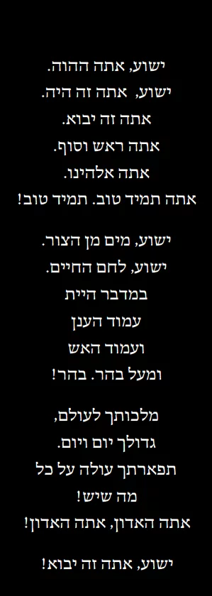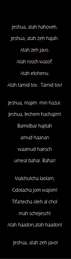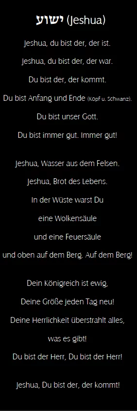 R) Du bist der Größte! Du bist der Einzigartige! Du bist der Höchste, und doch kommst Du uns so nah! Du stehst außerhalb der Zeit, denn Du hast sie gemacht. Du bleibst derselbe, gestern, heute und in Ewigkeit! In Ewigkeit, in Ewigkeit! |